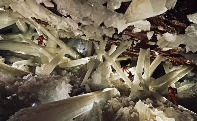 墨西哥巨型水晶洞穴埋藏在奇瓦瓦沙漠奈加山脉下980英尺的地方,迄今为止发现地球上最大型的水晶均埋藏于此。这里的水晶由于长期淹没在富含矿物质的水中,故生长得特别快。试想想,整个洞穴壁上插满巨大的剑状水晶,场面何其壮观!